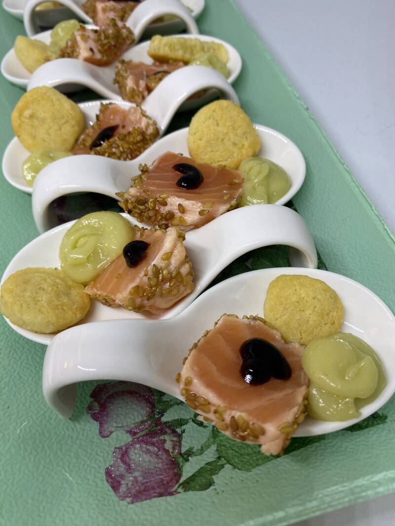 Tataki de saumon, mayonnaise au wasabi, sablé parmesan